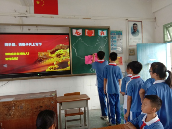 通過分享英雄故事,方老師引導同學們提煉出一個共同點:他們“熱愛人民,熱愛祖國,為人民謀幸福,為祖國謀發(fā)展”。有這么多的英雄為了我們現(xiàn)在的美好生活前仆后繼,不斷進取,不畏艱難困苦,奮勇拼搏!這也自然而然地升華了同學們的愛國情感,同學們紛紛覺得:作為中華人民共和國的一份子,生活在這樣一個越來越強大的祖國中,我們倍感驕傲、幸福與自豪!為了抒發(fā)同學們對祖國母親的愛,全班集體朗誦《我崇拜英雄》,并在卡紙上寫下自己將成為怎樣的人,如何實現(xiàn)?同學們都無限地感慨:我們要將自己的理想與中華民族偉大復興夢相結(jié)合,努力提升自身素質(zhì),豐富知識,開拓眼界,心懷民族,向英雄們看齊!
