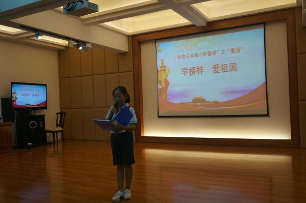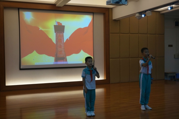 活動在莊嚴的隊儀式后正式開始。首先,主持人請各小隊的隊員上來分享他們在課下收集的關于毛澤東主席和周恩來總理的事跡,通過視頻、小品和詩朗誦的方式,隊員們了解了這些偉大的領袖人物的事跡,繼而在全體隊員心目中樹立起榜樣。隊員在活動中,還紛紛表示要向這些偉大的人物學習。接著,在了解了這些榜樣人物之后,隊員們還想到了,作為小小的少先隊員,沒有辦法像這些偉人和英雄一樣為祖國做貢獻,但是可以從自己做起,從身邊的小事做起,愛祖國,愛人民。于是,隊員們利用課余時間,排演了《當國歌響起時》和《撿起國旗》兩個小品,告訴隊員們如何尊重我們的國歌和國旗?隊員們深受啟發,明白了這些身邊的小事都是我們隊員日常生活中可以做的愛國行為。接著,隊員們就在“小心心”貼紙上寫下了自己的愛國宣言,然后全體隊員把這些愛國宣言貼到了中國版圖的展板上,把內在的愛國之情用實際的行動展示出來。