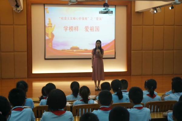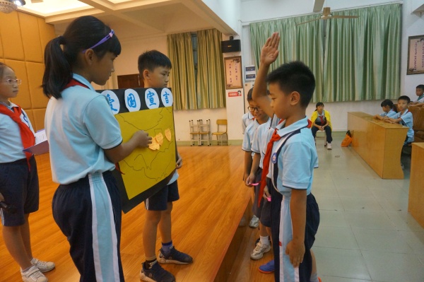 為積極響應中山市教研室關于開展中小學“愛國”德育主題班(隊團)課教學活動的號召,中山市沙溪鎮虎遜小學四(2)中隊于2019年10月24日下午開展了以“社會主義核心價值觀”之“愛國”——學榜樣,愛祖國為主題的隊課。在何溥彥輔導員的指導下,四(2)中隊的隊員們分小組籌劃了這次的中隊活動。當天下午,黃金奇校長還召集全校的青年輔導員來參加了此次四(2)中隊的隊活動。