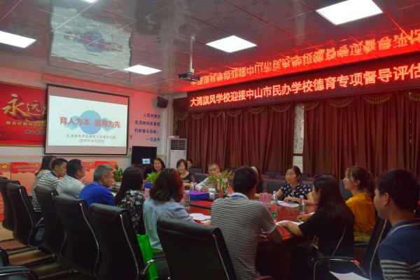 2019年10月23日下午,中山市南區教育指導中心及南區民辦學校的德育主任組成的督導評估小組蒞臨中山市大涌旗風學校進行督導評估,由大涌鎮教育事務指導中心民辦教育專干鄭凱旋、德育專干蕭若瑜、以及大涌旗風學校嚴丙武常務校長、葉莉主任、小學部蔡金艷校長、初中部章榮發校長、小學部羅柳德育副校長、初中部楊江鳴德育主任及各行政的陪同下進行素質教育督導評估檢查。