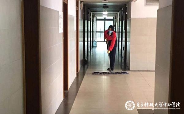 “同學(xué),先測下體溫,回到宿舍記得要先洗手,窗戶要打開通風(fēng)透氣,衣服要多穿一件,免得吹涼風(fēng)感冒了……”在10棟男生宿舍,一位戴口罩的宿管阿姨正在為留宿學(xué)生測量體溫;宿舍樓里,保潔員們各司其職,有的正為電梯消毒,有的正在走廊上拖地,安靜的樓道里散發(fā)著消毒水獨特的氣味,不時響起他們與學(xué)生相互問好的聲音。