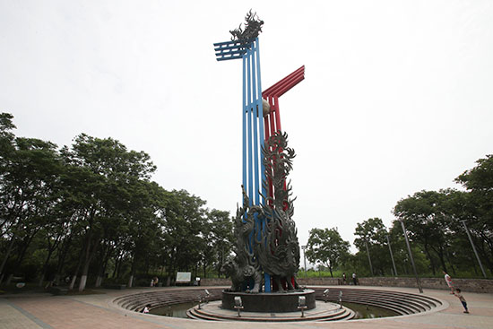 此外,采風團成員還參觀了2018年安徽省第十四屆運動會主要場館蚌埠市體育中心,并在蚌埠龍子湖畔看到了南北氣候分界標志。高39.9米的標志中部有八根鋼管,其中四根藍色的指向北方,象征北方氣候寒冷,另外四根紅色的指向南方,象征南方氣候溫暖。標志中間一顆青銅珍珠,表示蚌埠地處南北之間,集天南地北靈氣于一體。在蚌埠湖上升明月古民居博覽園內,450棟被修復重建的不同地區傳統民居建筑,讓采風團成員贊嘆不已。在蚌埠市博物館里,大家對蚌埠古代歷史、近現代城市發展史以及淮河歷史文化也有了更深入的了解。
